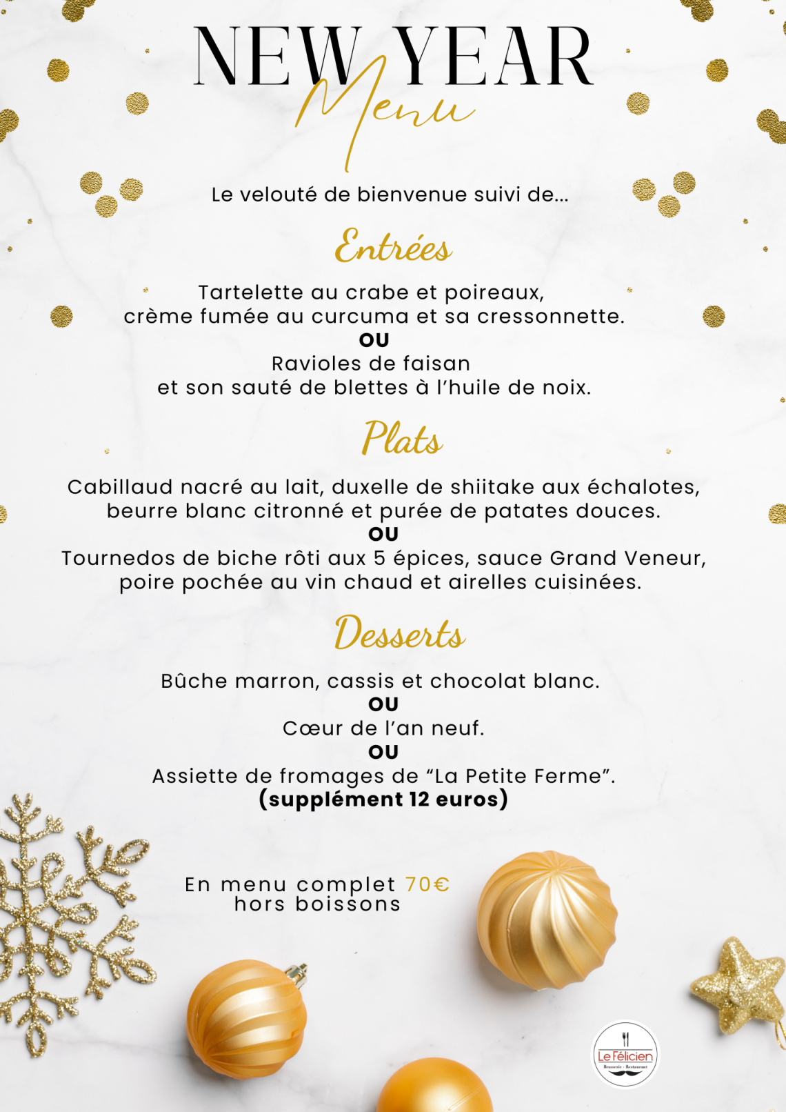 📅 Disponible uniquement le soir, du 31 décembre au 04 janvier. 🍽️ Durant cette période, le Menu du Nouvel An remplace le Menu Rops. 🎅 Le 31 décembre, service uniquement le soir (fermeture à midi). 📌 Le 1er janvier, la carte sera réduite, mais le Menu du Nouvel An sera également disponible à midi. ⚠️ Merci de préciser lors de votre réservation si vous souhaitez le Menu du Nouvel An ! 📞 Réservations : 081/39.53.23