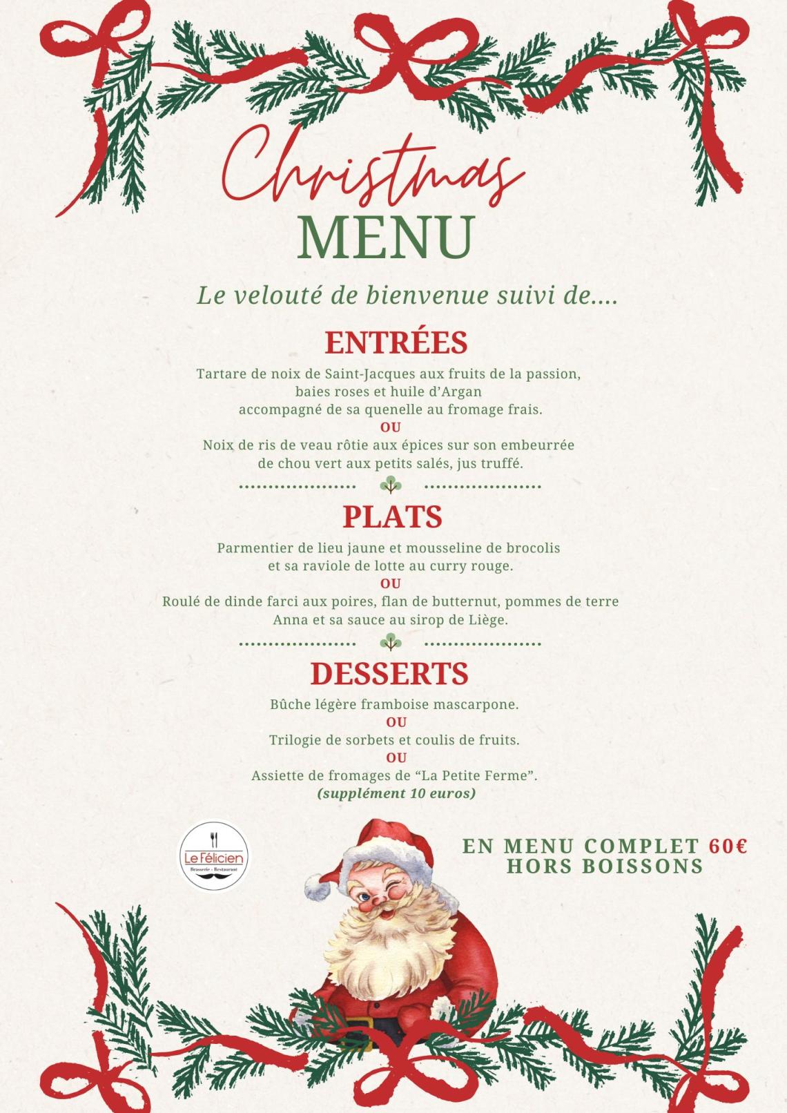📌 Les 25/12, la carte sera réduite mais le menu de Noël sera également disponible à midi.